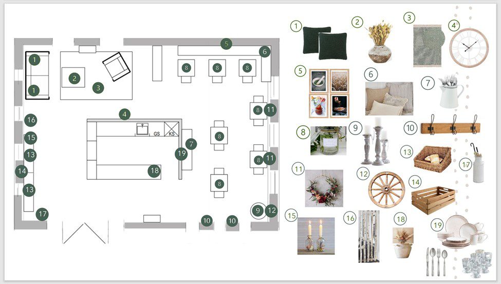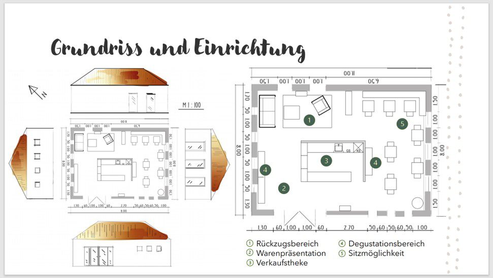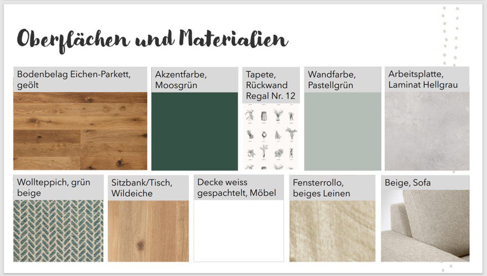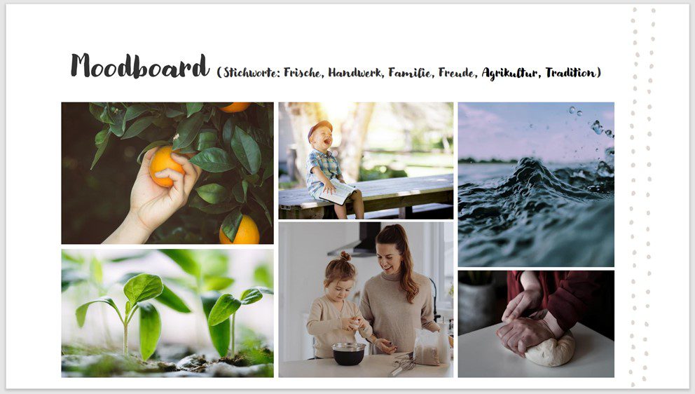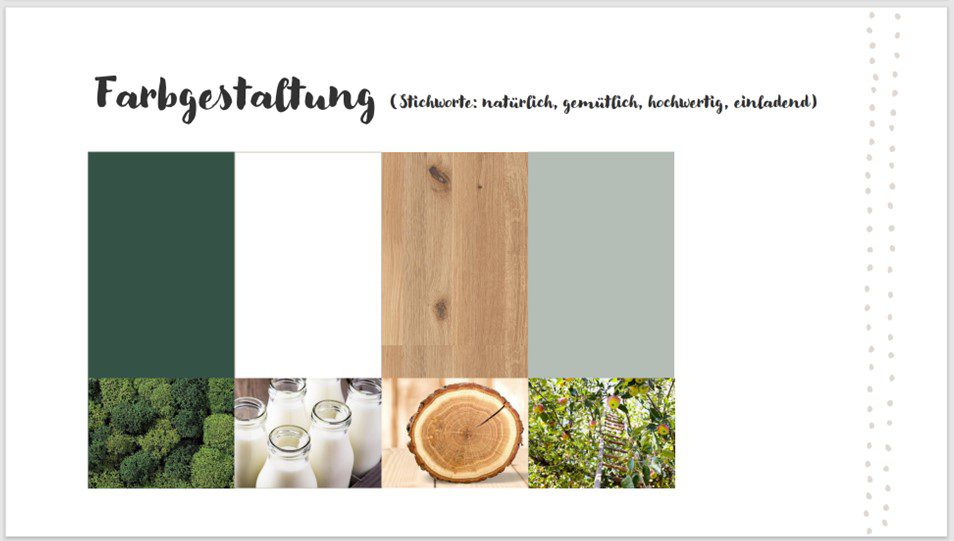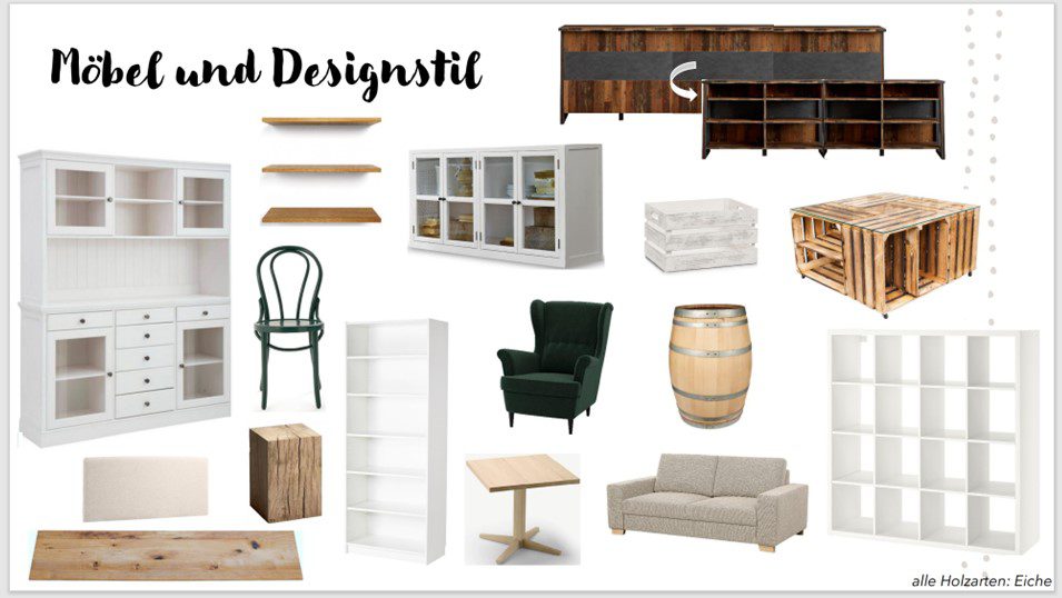 Wie bereits erwähnt, zeigen wir dir bei einzelnen Arbeitsschritten, wie wir diese bei einem Kundenauftrag angewendet haben. Der damalige Auftrag lautete, für einen Hofladen im Landhausstil Moodboard und Einrichtungskonzept zu erstellen. Auf Wunsch des Kunden haben wir das Konzept digital in PowerPoint erfasst.
